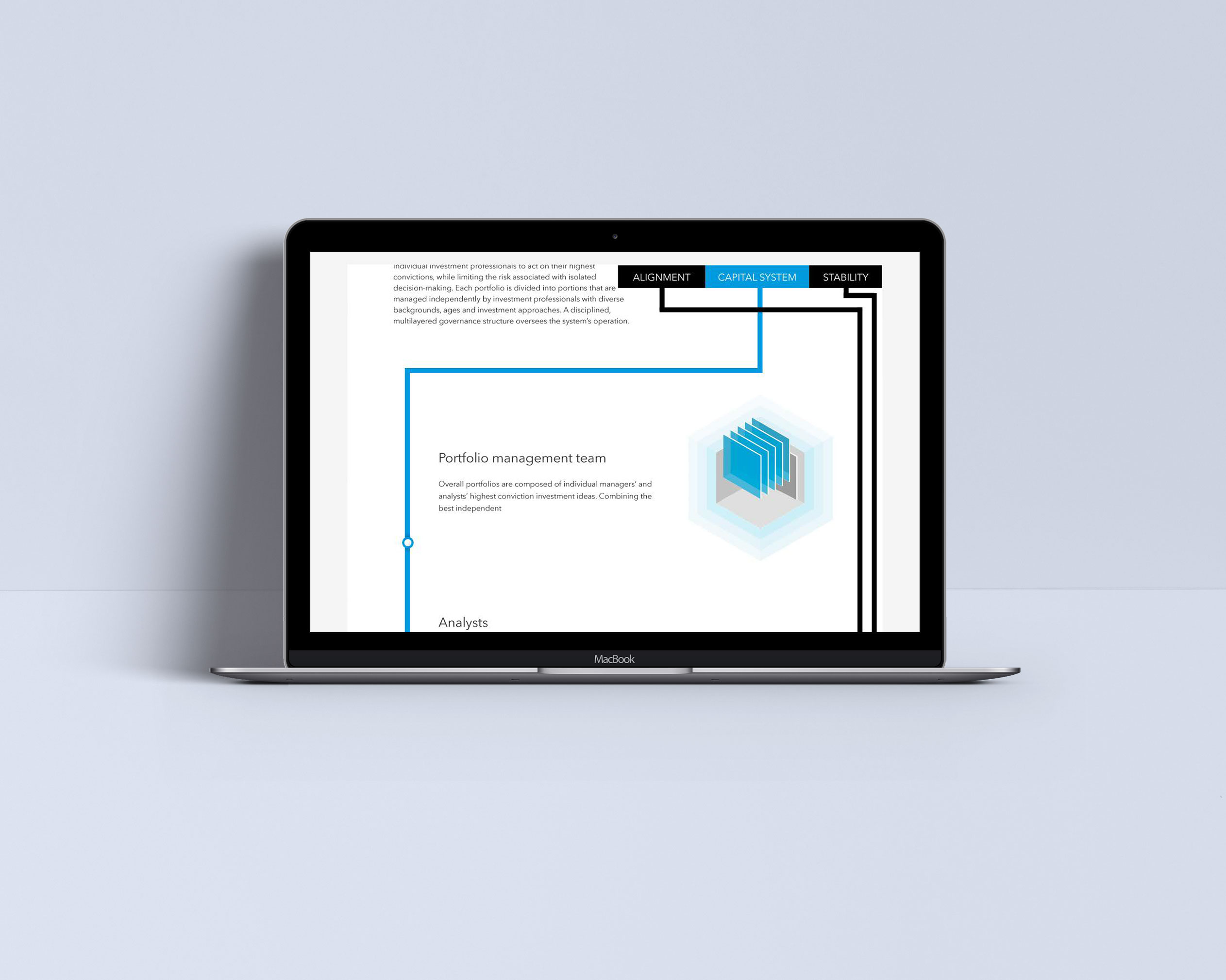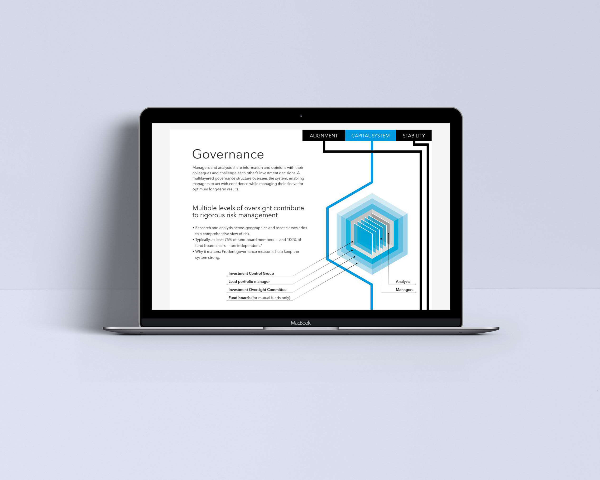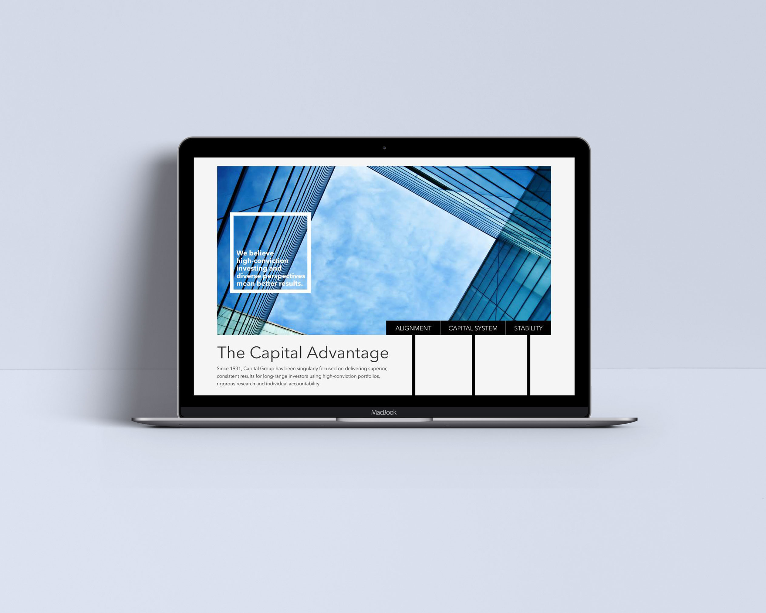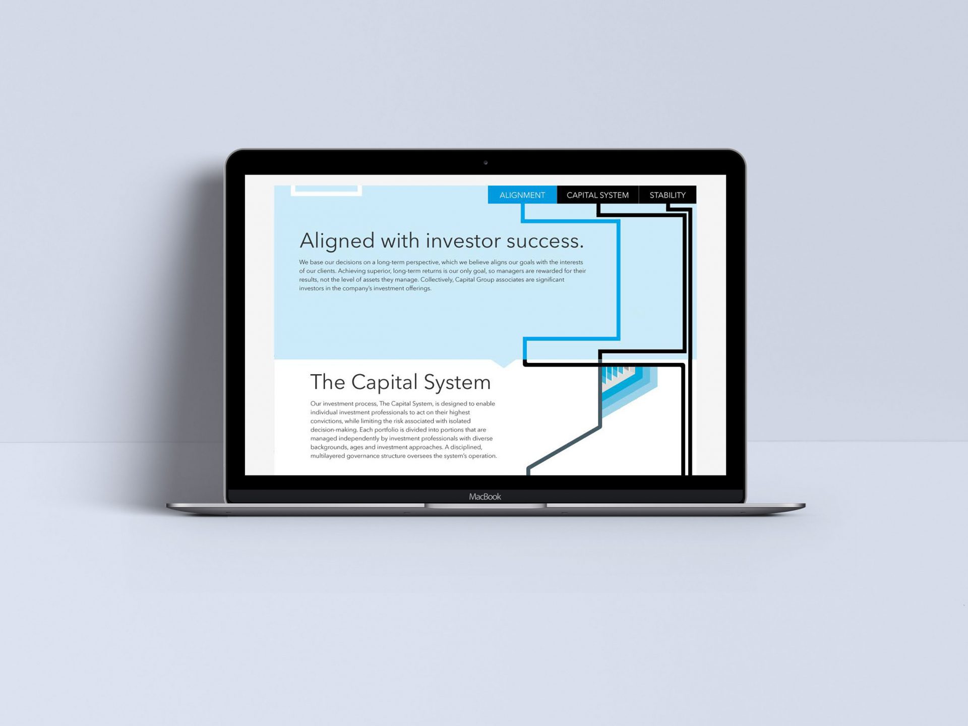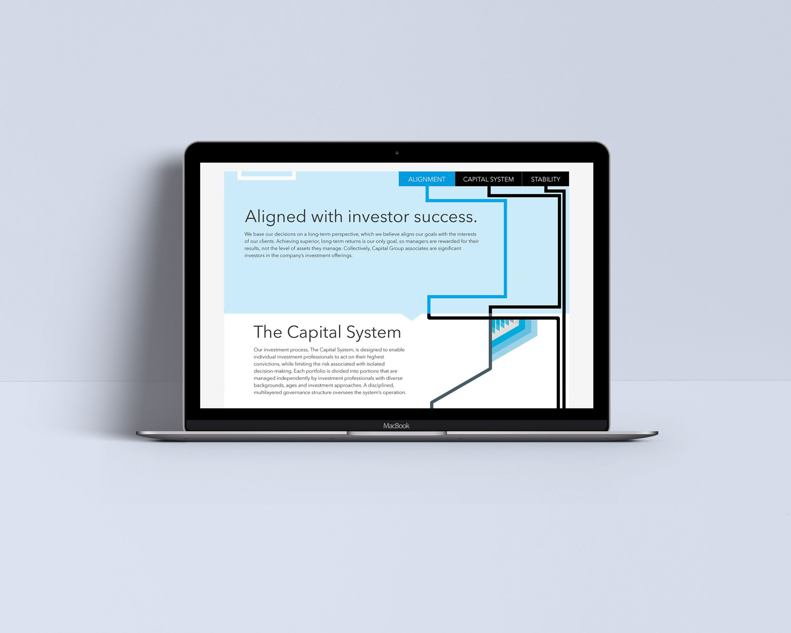 An immersive, parallax experience, explaining the complex system behind the storied success of Capital Group. The rigorous checks and balances set up create a system that is reliant on the best ideas of many, rather than one good idea from one individual.
